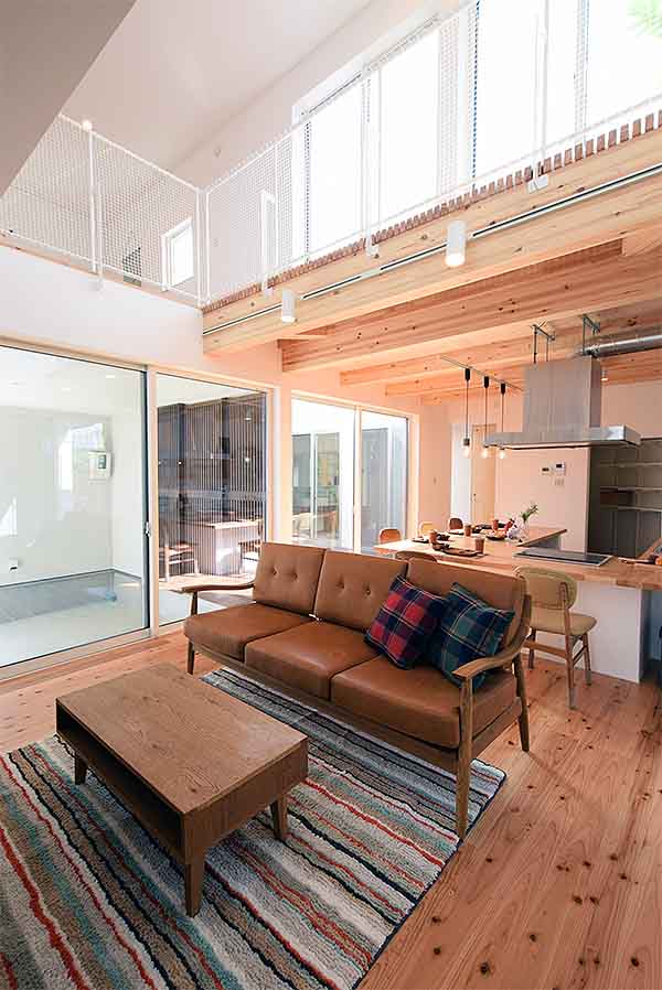 化粧垂木の勾配天井で迫力のあるLDKに。子上がりの和室や木組みの美しい大空間の壁は自然素材の塗り壁です。調湿&消臭効果のある身体に優しいお家に仕上げました。