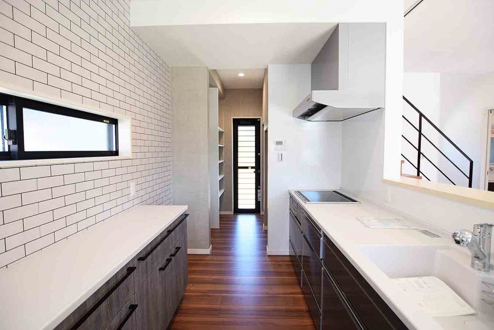 キッチンは対面式です。印象的なタイル調クロスで空間が引き締まります。たっぷり収納可能なパントリーには外へ繋がる便利な勝手口を設けました。