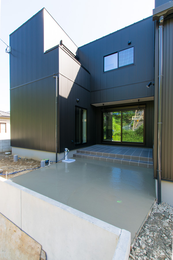 - タイルデッキをコの字型で囲うお家です。外観はブラックのガルバリウム鋼板でシックに仕上げました。