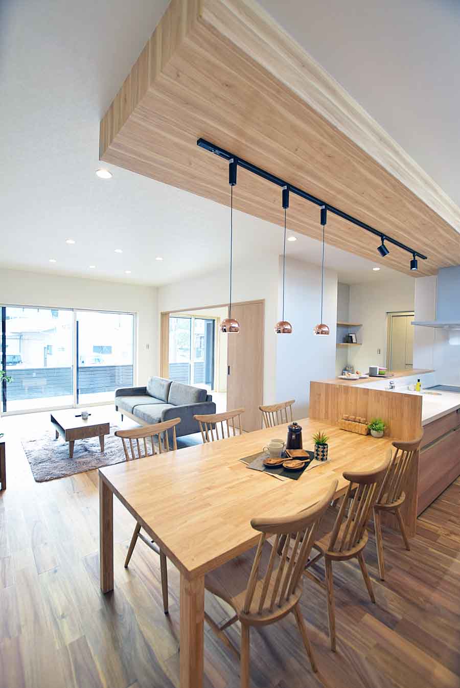 ダイニングカウンターは造作でキッチンと横並びに、配膳や後片付けも時短に一工夫。