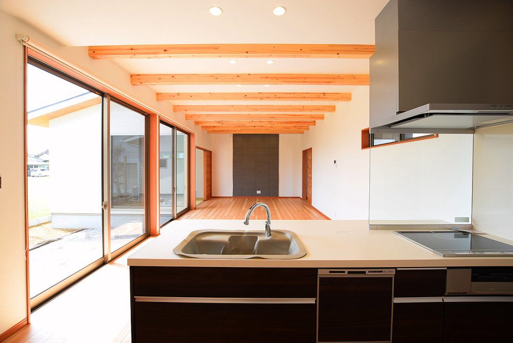 アイランドキッチンからリビングとウッドデッキが見渡せます。吹き抜けで開放感のある空間です。
