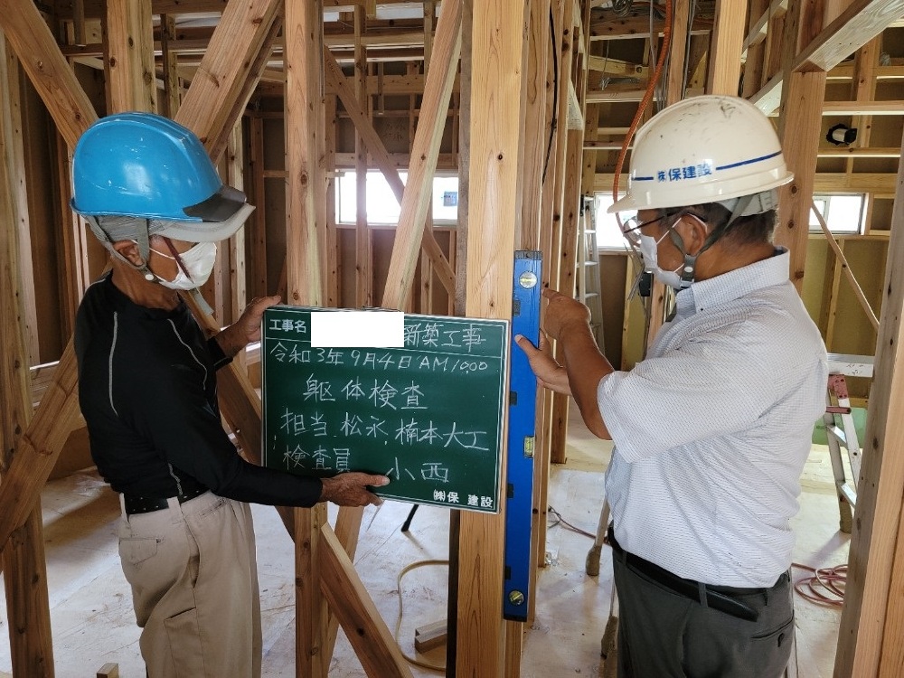 大工さんによる木工事完了を前に、外部検査官及び大工さん立会いのもとビスのピッチや仕上がりをチェックし、完了の検査を行いました。