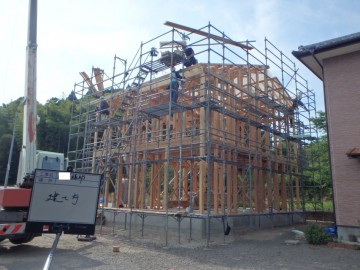 晴天に恵まれる中、いよいよ大工さんたちとクレーンによる建て方の作業です、一気にお家の姿が出来上がります。