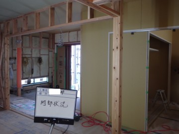 室内仕上げの下地材「プラスターボード」を貼っていきます。