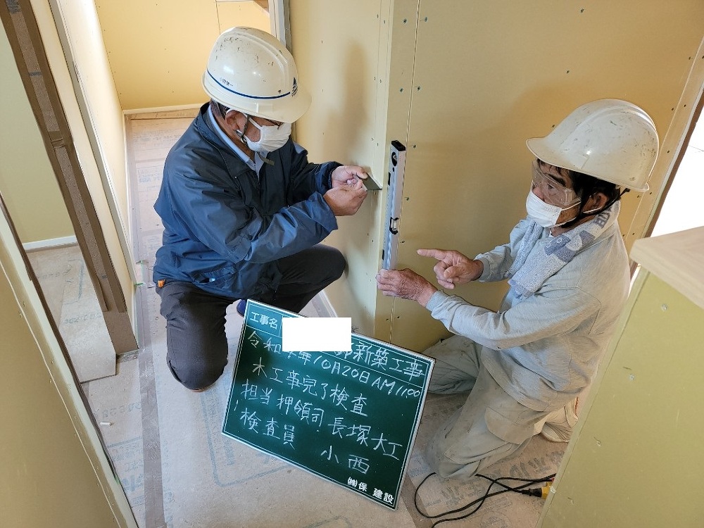 大工さんによる木工事完了を前に、外部検査官及び大工さん立会いのもとビスのピッチや仕上がりをチェックし、完了の検査を行いました。