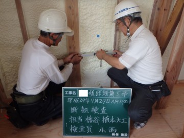 外部検査官により、躯体の検査を行いました。金物取付状況やくぎ打ちのピッチ等も細かく検査されます。