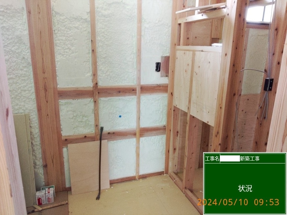 断熱材吹き付け状況(SDGs取り組みの一つ)