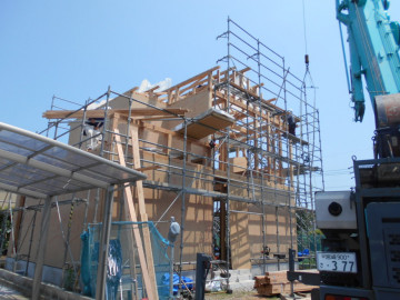 晴天に恵まれる中、いよいよ大工さんたちとクレーンによる建て方の作業です。一気にお家の姿が出来上がります。