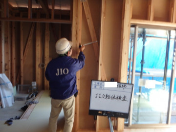 JIOによる2回目の検査です。柱・梁や筋交い・外壁パネル等が図面通りに配置され、それらが設計通り金物で補強されているか、屋根は規定通り造られているか等細かくチェックします。