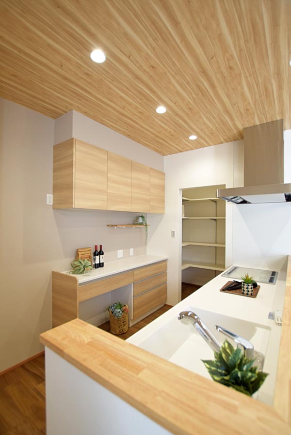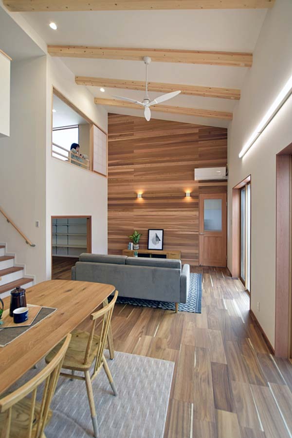 スキップフロアの和室から見下ろすリビング、天井いっぱいのレッドシダーは圧巻です。
