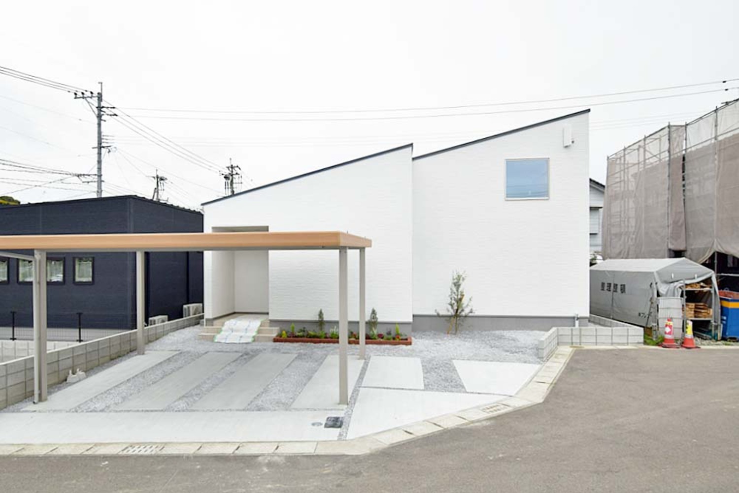 白を基調とした片流れのスタイリッシュな外観デザイン。